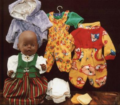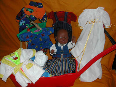 Dette er et bilde av tre av Baby Born-dukkene vi har lodda ut. Hvert år lager jeg dukke m/garderobe og dukkeseng. I tillegg syr jeg mye dukkeklær som selges til de som allerede er dukkemammaer...
