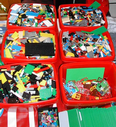 Her ser man hvordan ca. 30 kilo lego kan puttes i 6 bokser (noe er faktisk allerede tatt ut av boksene):