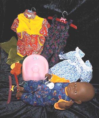 Dette er et bilde av tre av Baby Born-dukkene vi har lodda ut. Hvert år lager jeg dukke m/garderobe og dukkeseng. I tillegg syr jeg mye dukkeklær som selges til de som allerede er dukkemammaer...